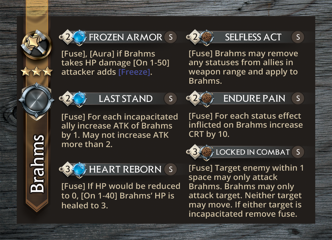 ++ 'Locked in Combat' can trap an enemy forcing them to engage in battle with Brahms until one of the two characters is incapacitated.