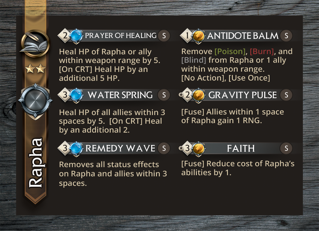 ++ Rapha can perform powerful healing abilities on herself and allies, as well as remove any status effect in a large area.